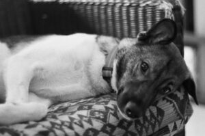 リードとハーネスを準備する。 犬が気付く。 尻尾を振り、こちらを見上げる。